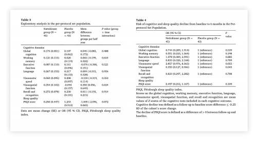 ▲ 论文表3(对符合方案集人群进行探索性分析)·表4(方案集人群从基线到6个月认知和睡眠质量下降的风险)